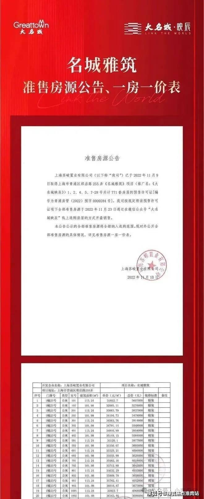 在2021年12月上海第三批集中供地中,大名城以底价摘得青浦区重固镇郏店路南侧44a-01地块,成交总价13.5亿元,成交楼板价16000元/㎡,房地联动价3.48万/㎡,即如今的大名城·映辰。