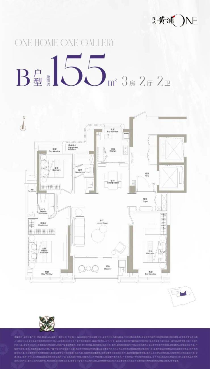 绿城·黄浦ONE规划了一幢住宅,两个户型依次排开,规整有序,边套是约193㎡4房2厅3卫,中间套是约155㎡3房2厅2卫户型,是纯粹改善大户型社区。