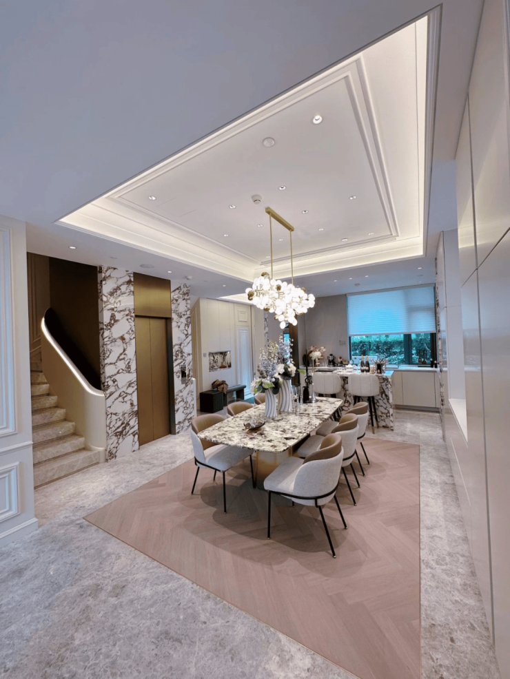 在室内设计上,入户大堂采用二层挑空设计,高贵大气,凸显空间感,提升大平层的整体价值;