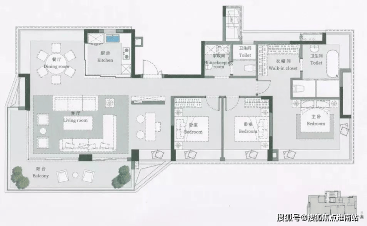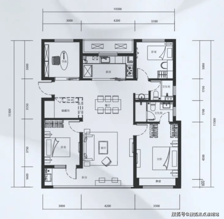 华润置地的113㎡三房,同样也设计了独立的储藏室,赋予大进深户型更强的功能性。