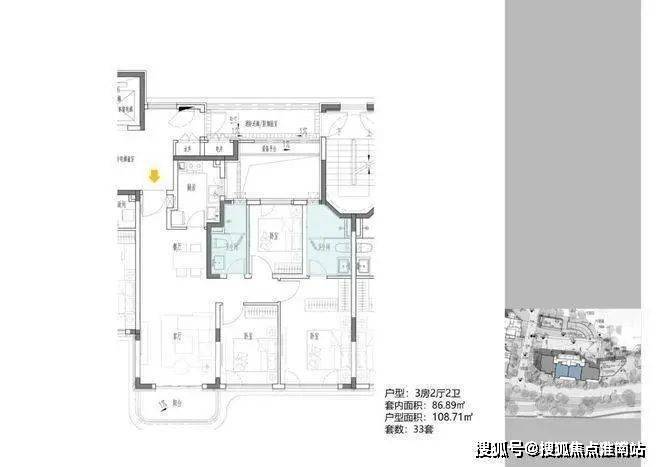 3地块容积率2.33,由一栋18层的小高层和两栋6层的花园洋房组成,共92套房源,产品建面约108-196㎡.