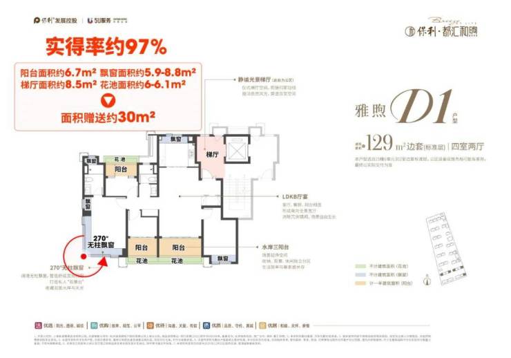 洋房标准层边套赠送面积约30㎡,实得率高达97%,相当于直接赠送约200多万价值,常规项目80%的实得率与之相比差距明显,该户型实际可享受常规155-160㎡的空间尺度。