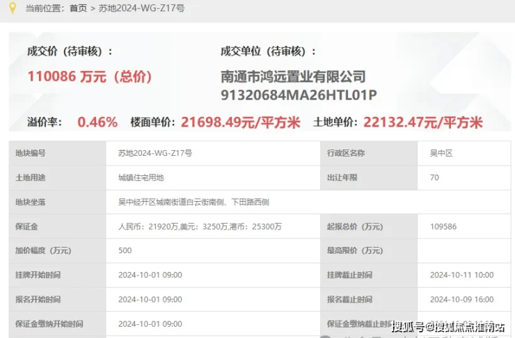 该地块(苏地2024-WG-Z17号)是南通市鸿远置业(南通海门国资背景)以总价11.01亿竞得,楼面价:21698.49元/平,溢价率0.46%。
