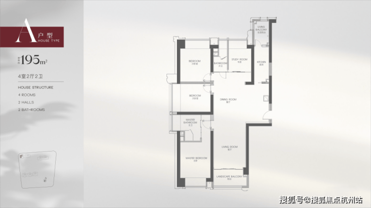 260㎡四房:边套设计,三面采光,客餐厅连接南向大阳台,公区尺度阔绰,主卧套房带独立衣帽间与卫浴