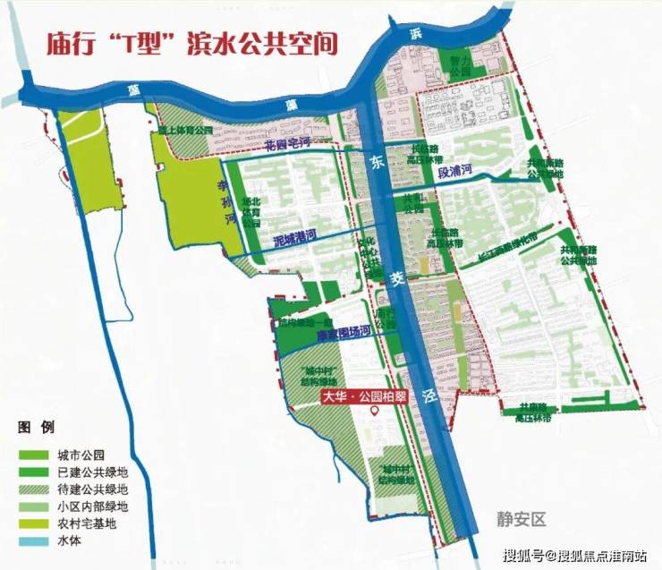 庙行镇的宜居基因,根植于 “水绿共生”的规划哲学。 以 ”蕰藻浜,东茭泾“T字滨水公共空间为骨架,以”四座公园,千亩绿地”为肌理,着力构建无界共融的“一T双环”公园城市格局。