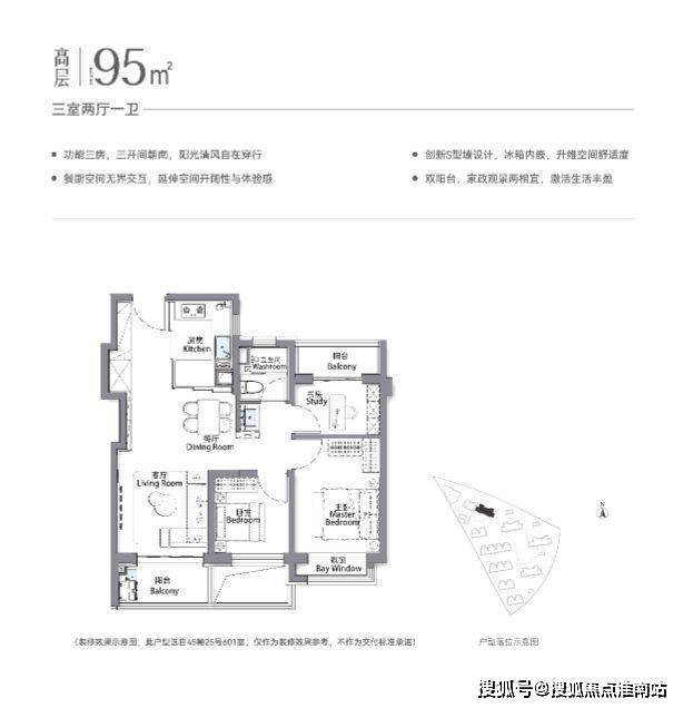 建面约95㎡高层,全系方正户型,双阳台设计,LDKB一体化设计,贯通动区轴线,打造温馨的家庭生活聚餐;