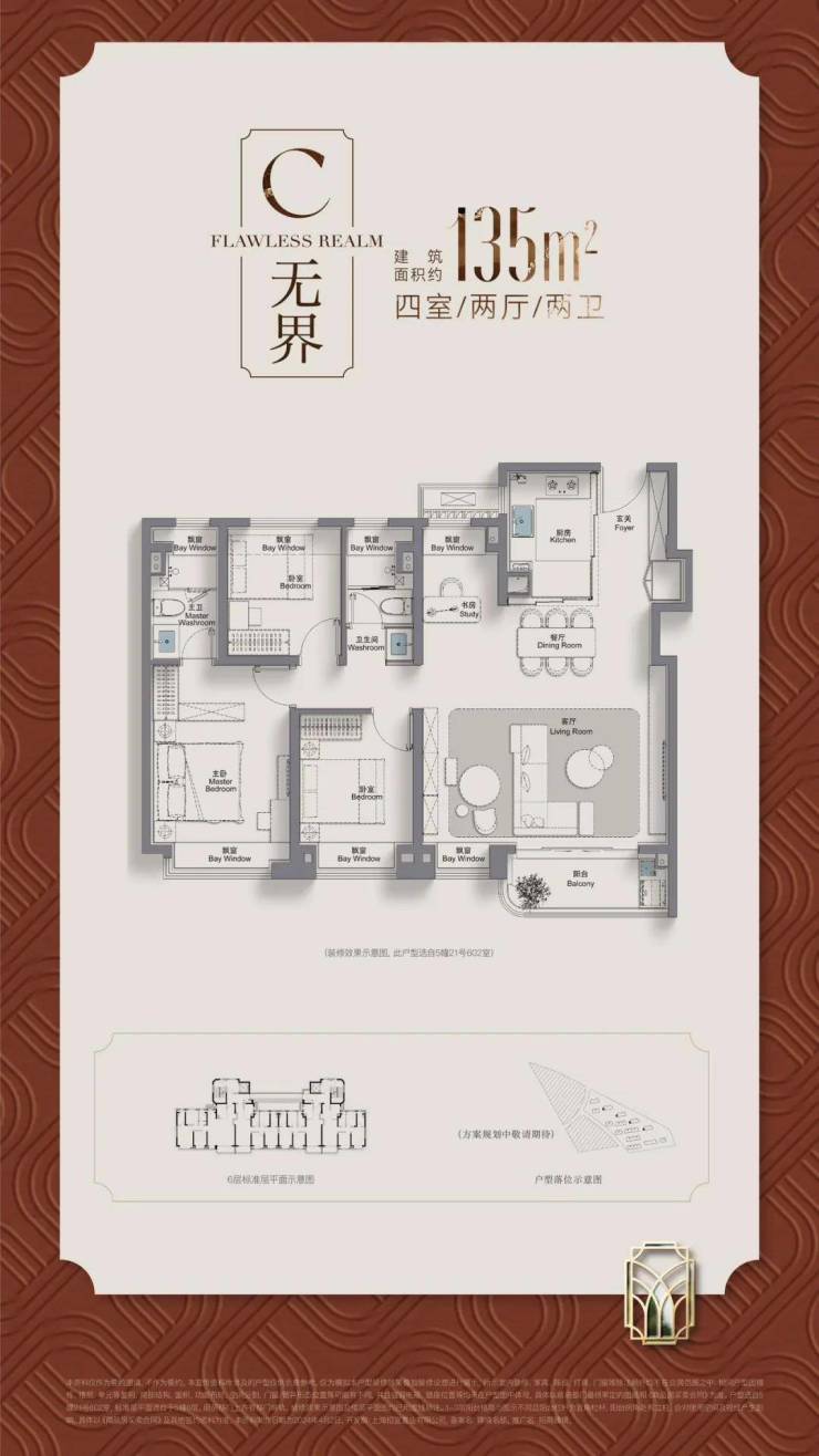 135㎡ 4 房 2 厅 2 卫(楼王):四开间朝南、270° 转角阳台、主卧套房;单价 6.7-6.9 万 /㎡,总价 900-1020 万