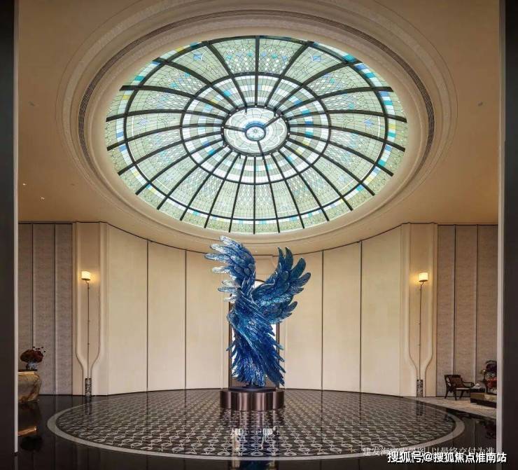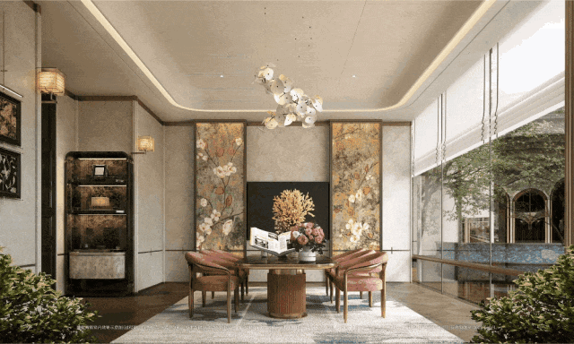 以玉兰门庭—迎归大堂—莳花荟为主轴,敬献步履生辉的归家艺旅:玉兰门庭如繁花盛绽,尊华瑞鳞水景聚运生财,双尊铜狮镇守家宅;迎归大堂流转光影艺韵,百羽栖澜艺术雕塑、芦海宸韵非遗绣作流淌摩登气韵;莳花荟中央会客厅移步异景,献映会客、休闲等雅会。