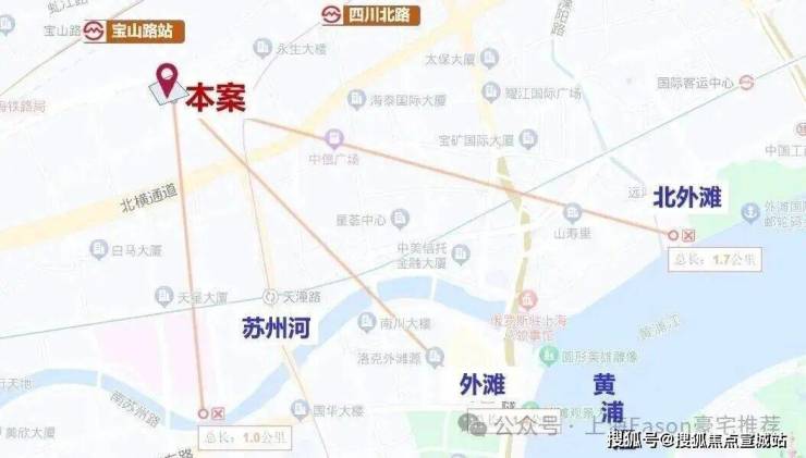 仅从图上看,该地块直线距苏州河约1公里,直线距外滩约1.4公里,直线距北外滩约1.7公里,直线距3/4号线宝山路站约300米,直线距10号线四川北路站约560米,区位优势明显。