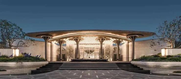 项目恢弘大气的门头,项目设计师以浮岛为灵感,将几根立柱化作悬浮的雕塑,撑起一片轻盈的仪式感。