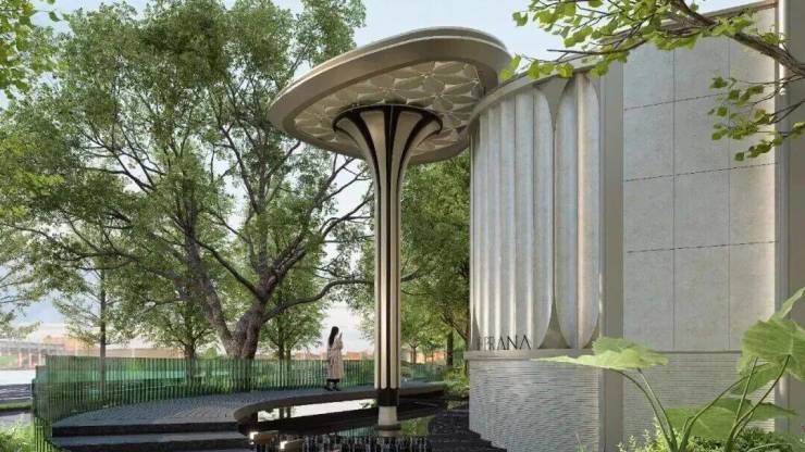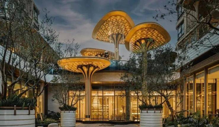 以雅艺柔美的对称主义构筑社区入口大门,从森林中获取灵感,宏观提取叶脉形态,呈现犹如自然中的脉络与流动;同时深入微观的细胞视角,复刻植物的几何纹理与结构逻辑,以自然的秩序与美学塑造“花瓣状的母题造型”。
