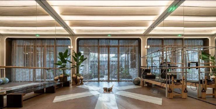 汗水滴落如晨露,呼吸随普拉提的动作起伏,每一次重复都是向前的印记,也是缪斯喜爱的健康生活方式。序厅和健身房内部设计为天花圆形发光膜和弧形艺术玻璃门,在大量拱形元素中点缀部分拼花装饰,让整个空间彰显柔润平和的质感与井井有条的秩序感。