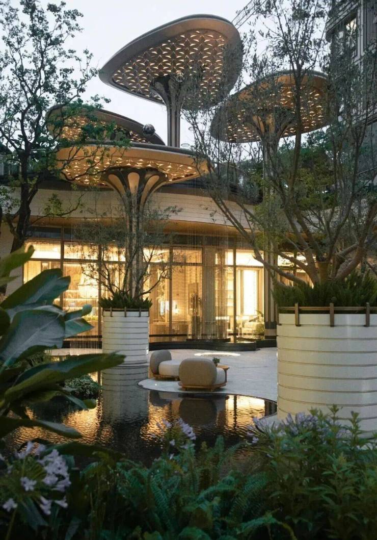 仿佛在林间绽放的花瓣,亦如极具生命力的大树,豁然呈现在归家业主面前。既呼应了整体场地的自然氛围,又营造出奢华与前卫并存的视觉冲击,呈现出一场优雅奢华、又极富松弛感的归家仪式。