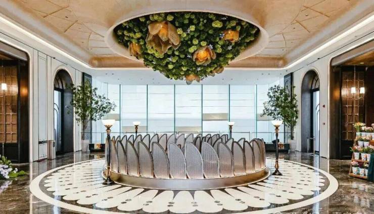 让自然的气息在室内流淌,在阳光与空气的轻抚下,为空间注入生机与灵动。负一层浅洽谈区中一丛丛似锦繁花,营造出湿润绿林的微气候,光线温柔洒落,与花卉艺术品相映成趣。墙面艺术画作中抽象化的自然雨林,以浓烈的色彩与肌理,呼应着东西方园林共有的,对生命丰饶与形式美的极致颂扬。