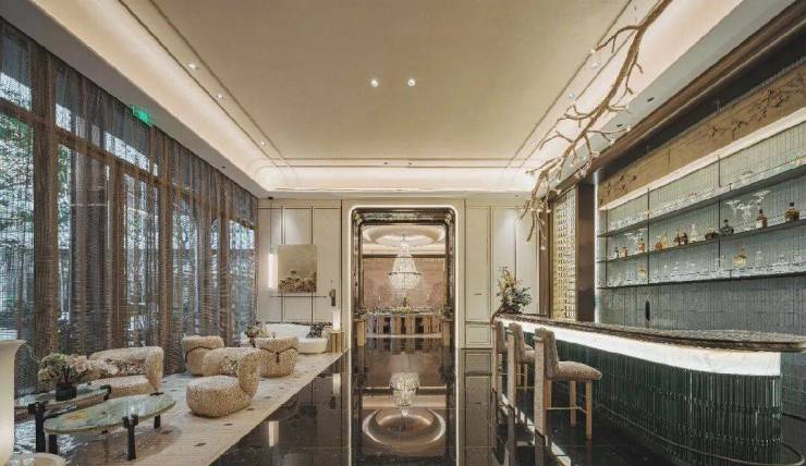 依托着超大落地窗的水吧花房,在宽敞的服务式空间中,以视觉美学与情感共鸣为设计语言,引入“一束雪梅”的艺术灯饰为视觉重点,打造五感沉浸的都市社交绿洲,于此交谈、休憩便能感受极具意境的轻松氛围。
