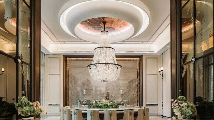 在景观落地窗环绕中,私宴厅以“花廊序列,美学对景”构筑专属的私谧空间,巨型水晶吊灯与浅色饰面的搭配,色彩质感上相得益彰,营造融合艺术、文化与生活美学的奢享感场域,成就令人神往的优雅社交范式。