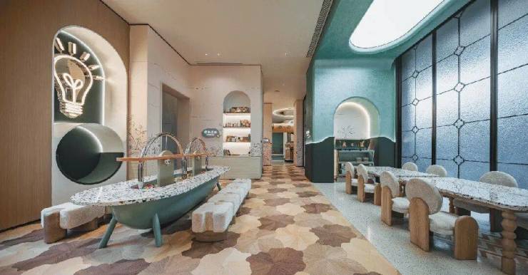 可爱的绿色小泰坦不远万里,为孩子们带来一场奇趣体验。设计师以孩子的视角,布局童梦天地,更低的桌椅、更柔软的材质、更温暖的画面,在有限的空间里回应童年无限的好奇与渴望。