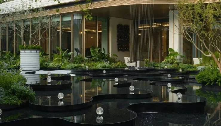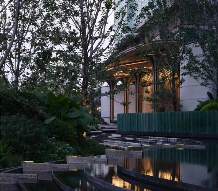 以匠心雕琢光影水韵之美,层叠水景与灯光延展出优雅的序列;以传奇的蒂芙尼蓝为灵感源泉,采用独创的U型玻璃熔铸工艺,将琉璃的梦幻光泽与水的灵动质感完美融合。