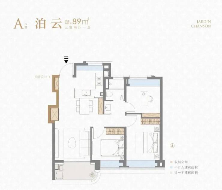 重点我想说说该户型的收纳,大量S墙的设计简直见缝插针,极大的扩容了家的储物角落,消减了业主生活的繁琐。