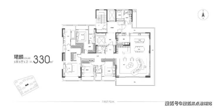 值得一提,建面约330㎡5房5卫,还有霸气的270度跑道式阳台和超级转角厅: