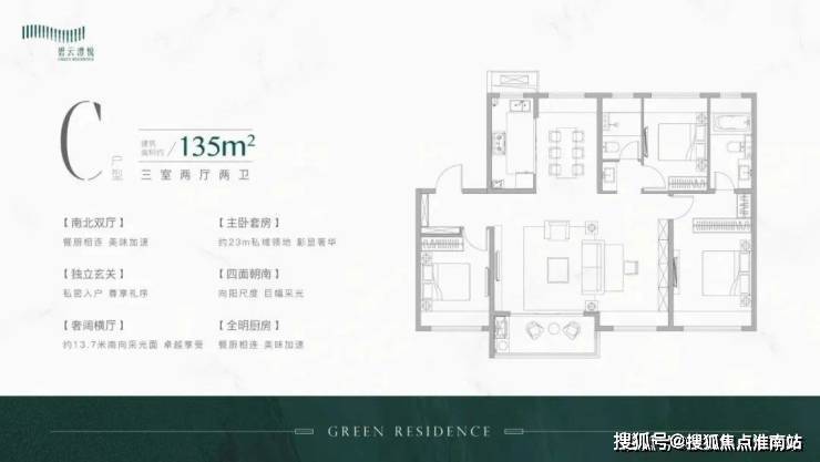 此户型可以说是改善人群非常喜欢的户型,建面约135㎡3房2厅2卫设计,动静分区,四开间朝南,各空间尺度奢阔,还有一个超大面宽的景观阳台,实现功能性和舒适度兼得。