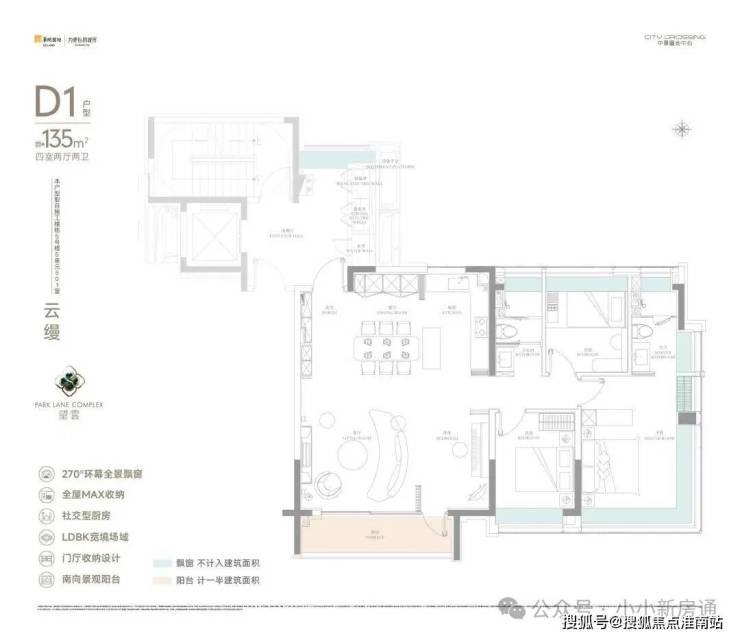 首先是进门即映入眼帘的LDBK一体化设计,搭配X灵动空间以及巨型宽面阳台,奢阔尺度非常出众;主卧约270°的转角飘窗,视野和采光全部拉满。