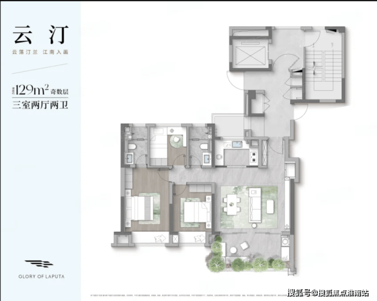 户型点评:3房2厅2卫的房屋套型;3开间朝南,客厅+餐厅的宽厅设计;南向超大空中庭院;主卧是套房设计,有独立的卫生间和衣帽间