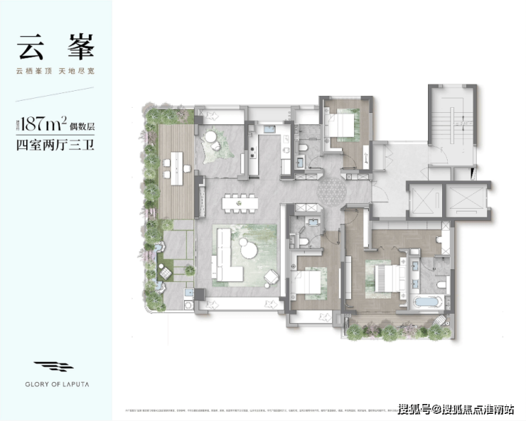 户型点评:4房2卫的房屋套型;偶数层南向超大L型空中庭院;四开间、三卧室朝南设计;偶数层北面有个北庭院;