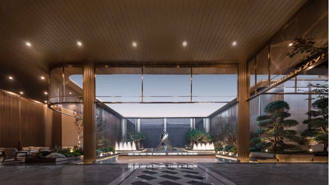 入口处酒店港湾式落客空间,艺术感造型树,蓝翡翠奢石达到第一眼的惊艳;内部精致典藏的水院空间,以雕塑、喷泉水幕、造型树经典组合,打造全区景观点,更大地扩充与景观的接触面,度假的松弛感油然而生。