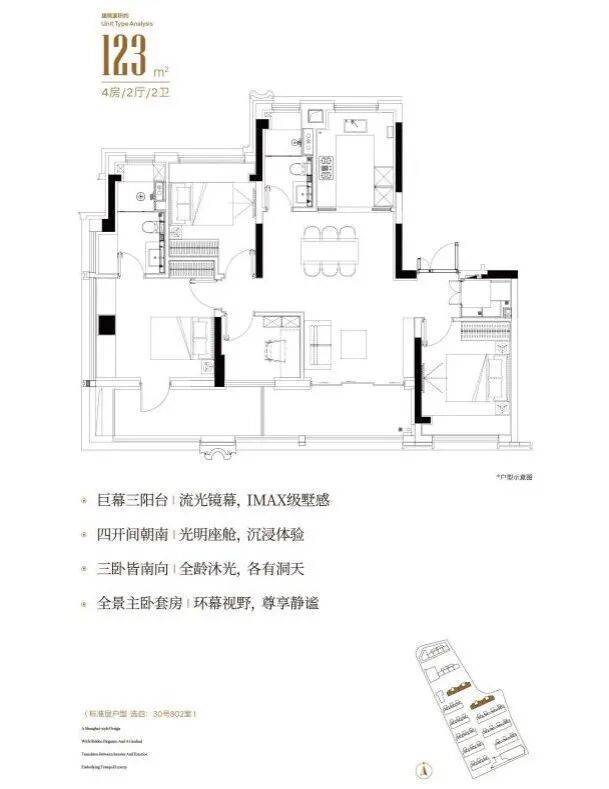 项目建面约123㎡户型则是区域内仅有同面积段宽厅4开间朝南4房南北通透户型,附赠面积高达约17.6㎡,无论是在使用功能上和尺度上,都远超同面积段其他户型。