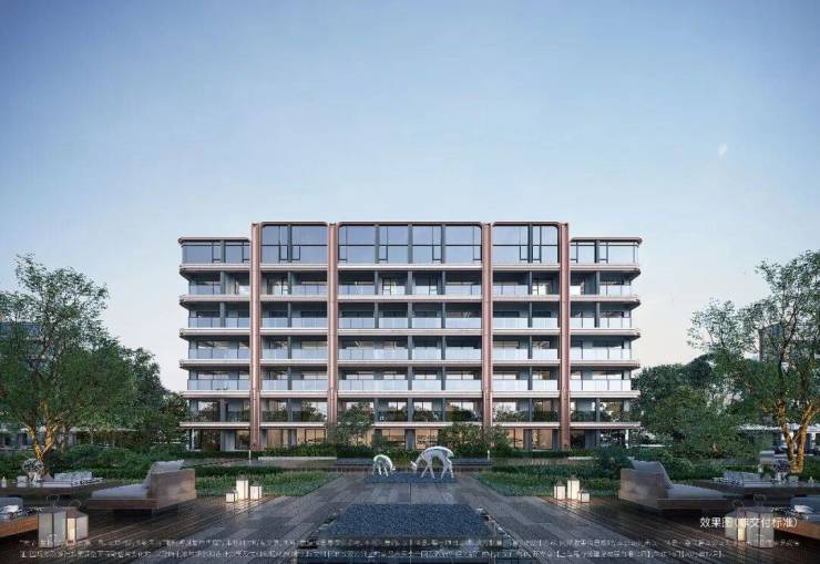在选材上,项目采用米色石材、铝板和金属镶框进行多元混搭,重点刻画单元入口、入户大堂等细节,质感非常丰富。尤其艺术感的弧形镜面立面,与门前蜿蜒的水岸风光相呼应,让建筑仿佛拥有了呼吸感和浪漫的情绪。