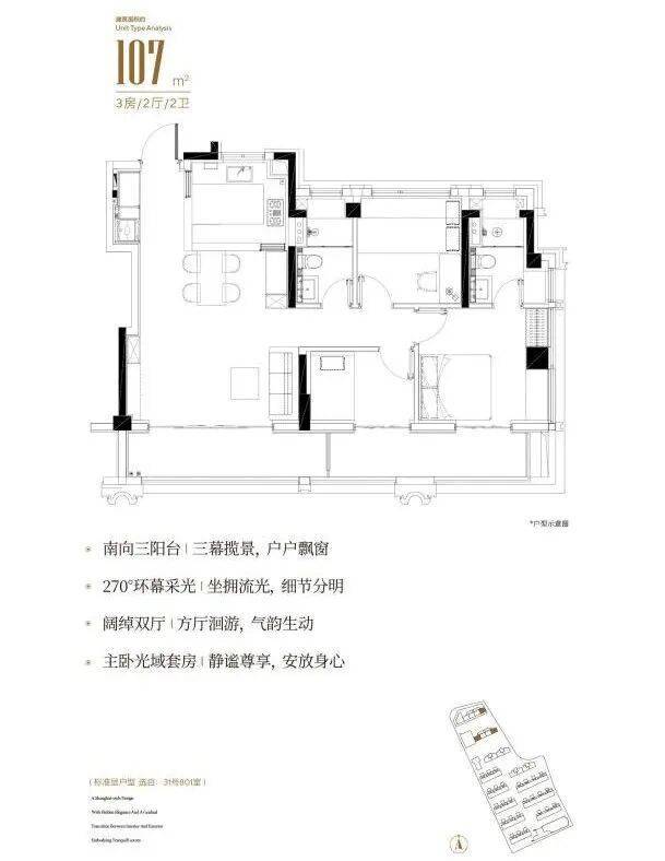 同时建面约107㎡户型做到做到了约5米超大宽厅设计,3.5南向面宽+南北通透的格局让采光通风效果俱佳。主卧套房配置,朝南次卧面宽约3.2米外接阳台,朝北带大飘窗,做到了真正的大三房功能,每个空间的尺度都远超同面积段区域其他产品,妥妥的明星户型!
