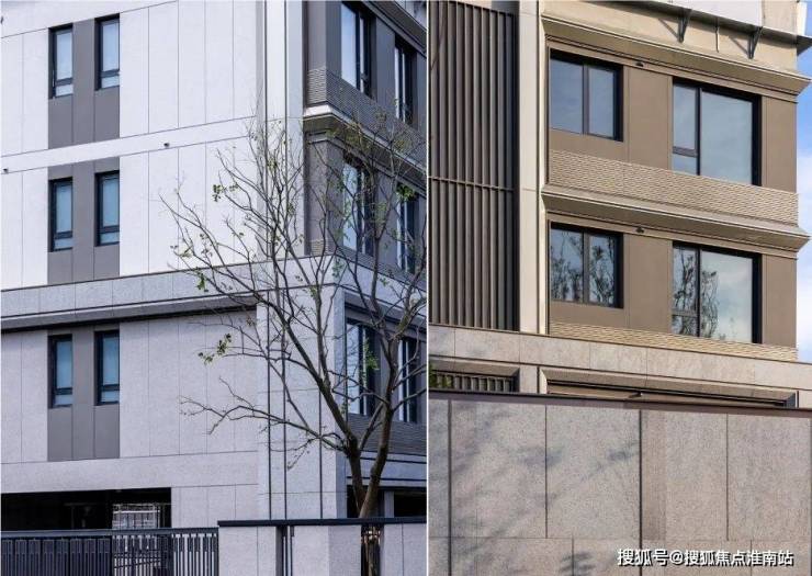 整体外立面以 浅色香槟铝板线条、深色香槟铝板窗套搭配暖灰色真石漆,配色更具活力。
