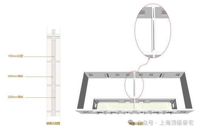 与其他风貌共用一堵分户墙不同的是,忻园的风貌别墅采用双层分户墙做法,每户之间没有共用墙。200mm厚度的墙体,中间还设置了100mm空腔,避免邻里的相互影响,带来舒适静谧的居住感受。