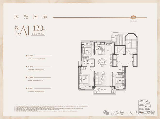 户型特点:边套户型,3开间朝南,方正格局。客餐厅一体化设计,餐厅空间宽敞,客厅进深较短但可通过与阳台连通优化空间感。全屋飘窗设计,边套南北卧室为270°转角飘窗,采光充足。独立电梯厅约7-8㎡,可改造为玄关或收纳空间。