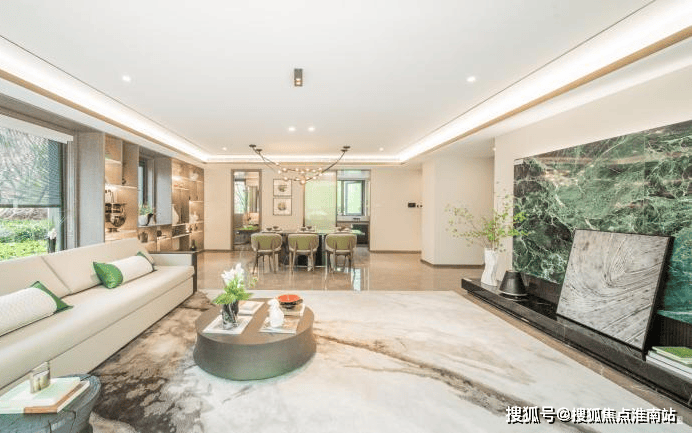 看一眼外立面,白色石材、香槟色的木纹铝板、大面积玻璃的拼接组合,怎么看都不像一个门槛只有400万+的低密叠墅。玉琮水景、山石跌水等等融入景观的大量良渚文明元素,弥漫着专属于杭州的千年气韵。满眼的“越级感”再配上只有1.2的超低容积率,最终才呈现出一座全低密真双叠大盘的样子。