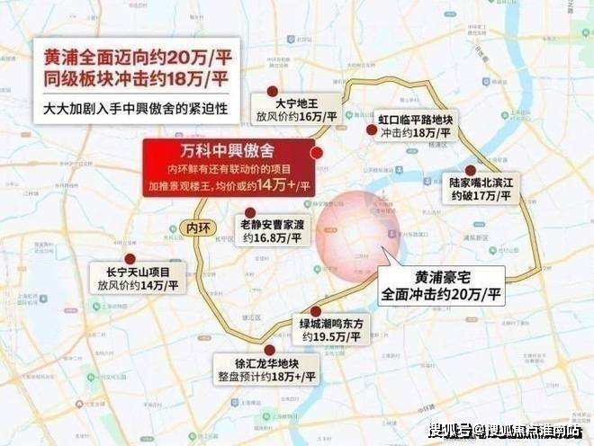 万科中興傲舍从上一次开盘至今,市场变化很大,新房价格疯涨,黄浦豪宅全线迈进20万/平;内中环徐汇滨江飙到19.5万/平,与项目同纬度的虹口内环冲击18万+/平;甚至不少内中环项目要卖到14-16万/平。(来源网上房地产以及楼板价倒推)