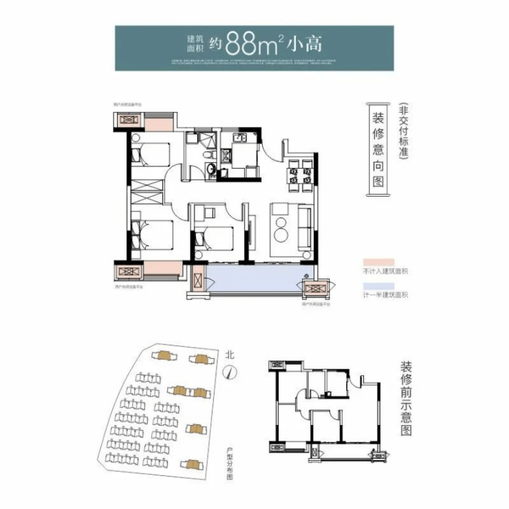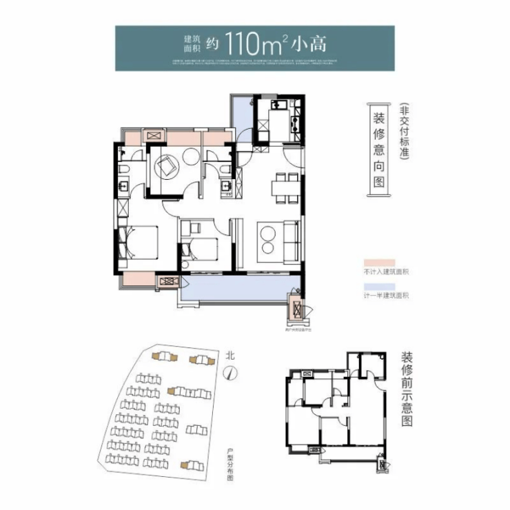 建面约110㎡户型空间排布与建面约88㎡户型近似,保证了户型方正、三开间朝南。