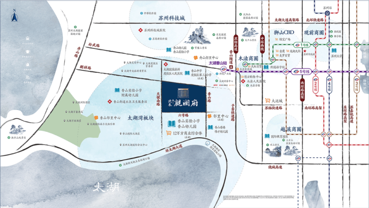 除此之外,北辰观澜府拥有不可复制的生态资源,距离太湖直线距离约900米,同时背靠灵岩山、天平山、穹窿山、 渔洋山等不可复制的自然资源。