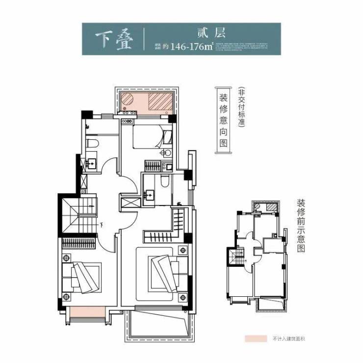 以叠墅产品为例:建面约110-176㎡的叠墅,为正统的上下叠产品,上下双层的空间构成,功能空间舒阔充分。