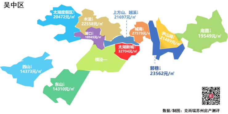 据克而瑞数据统计显示,今年10月苏州市区新房成交均价为22726元/㎡,同比下跌1.71%,从苏州大市各区房价来看,吴中区依然处于低位。