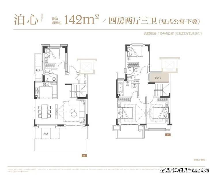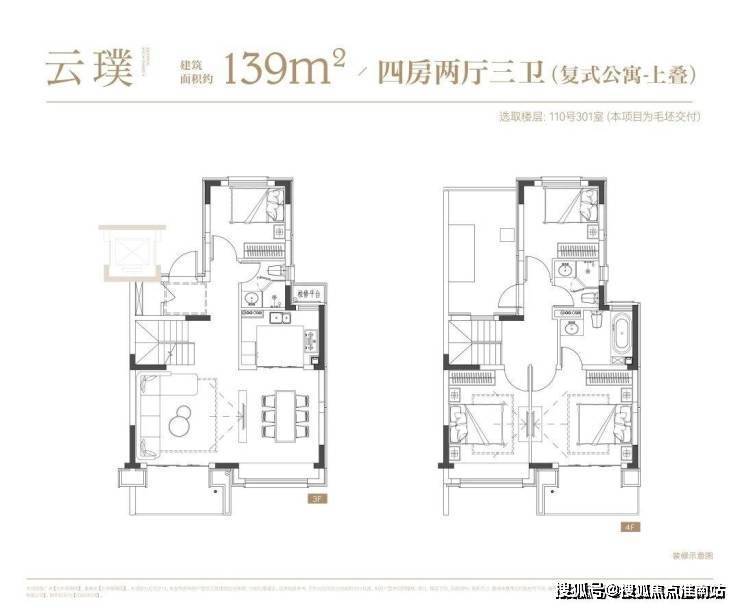叠墅:叠墅一共四层,分为上/下叠,上叠建筑面积约139㎡,下叠建筑面积约142㎡。