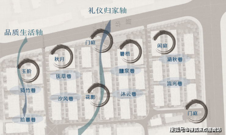 “碧梧、花影、秋月、玉阶、闲庭”五大院落,定制八巷生活场景,包括流光巷、涵秋巷、沐云巷、酌泉巷、汐风巷、抚草巷、拾翠巷、猗竹巷。