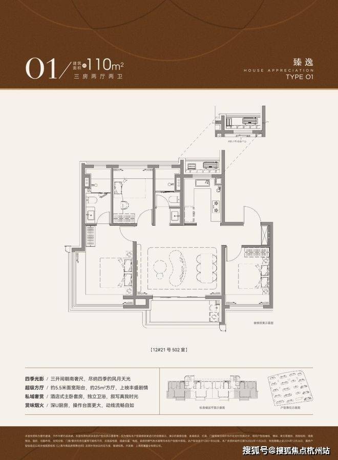 户型:建面约 89㎡三房一卫、99-103-110㎡三房两卫、126㎡三房两卫、144㎡四房两卫高层住宅(总高 21 层,2 梯 4 户,得房率约 77%);全系精装交付,配备中央空调、地暖、新风系统,方太厨卫三件套