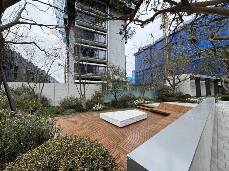 通道两边都做了如下这样的休闲卡座、绿化带、小组团景观,极力弱化了小区的边界感;两边地块的入户门头连同地面铺装也都是做好的。