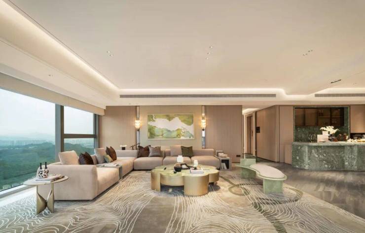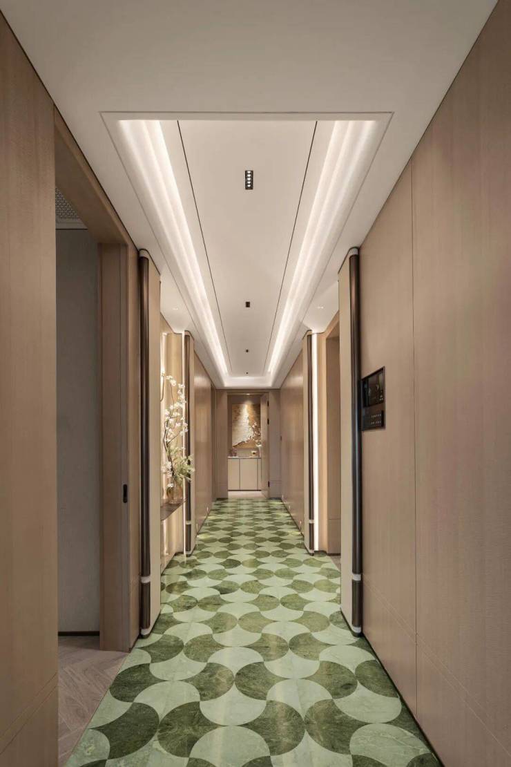 主卧的锤纹门把手、地板花瓣拼、镂花的空调出风口每一个都是世界级的工艺。同样,精装的用材也很考究,从电梯厅到室内各种奢材在这里齐聚,瑞士翡翠、白雪公主、蒂芙尼绿、巴黎金等奢石,还有仿锤纹夹丝玻璃、仿古锈镜、隐木这些罕见用材增添艺术质感。