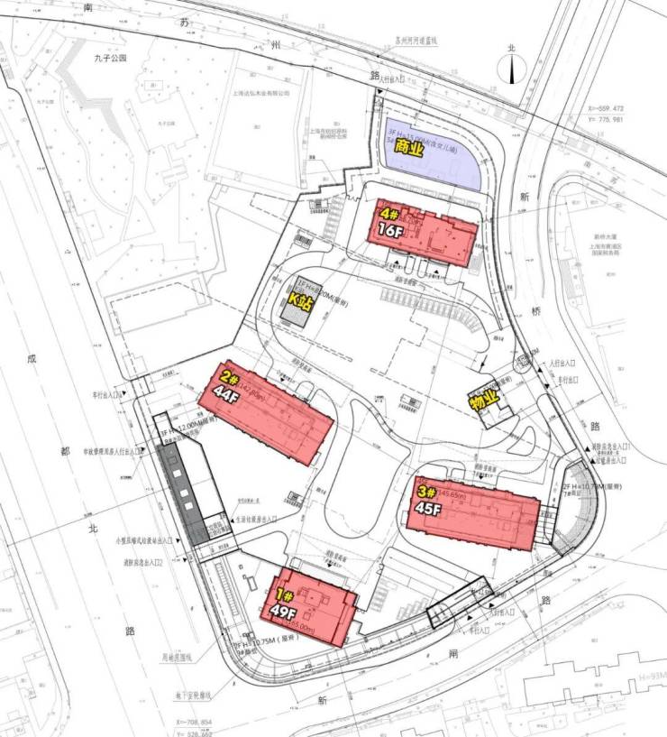 1#地块由四幢住宅组成,其中1幢住宅建筑高度能到165米,将超过浦西顶豪海泰北外滩和150米高的华侨城苏河湾双子塔。更是高于153米高的陆家嘴汤臣一品。其余2#和3#分别在142-145米左右,44-45层楼。4#则是16层高的住宅。
