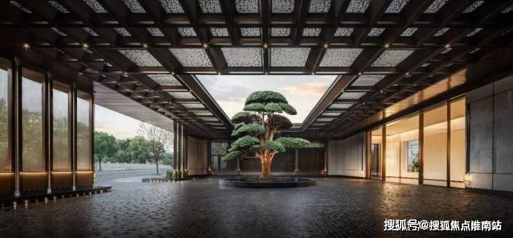 宽阔的门头有古松相迎,含蓄的格栅与天井透露出隐奢意境。