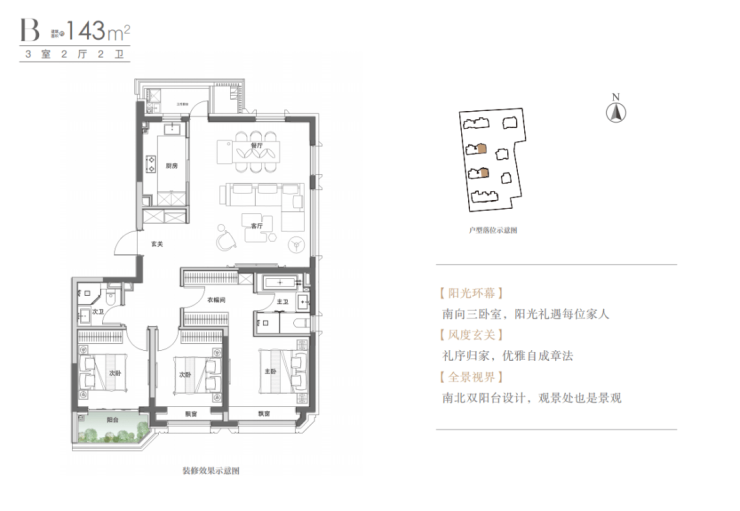 建面约143㎡ 3房产品,边厅户型,拥有超配北阳台空间,可作为家政空间使用,南向全明三卧室,通透舒适。