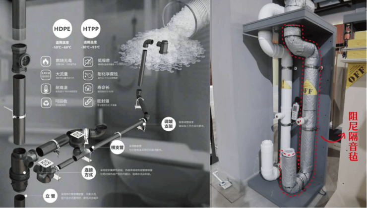 3.下水的噪音,主要来源于下水时管道的振动,而项目采用阻尼隔声毡与管道结为一体,通过阻尼特性降低水流撞击管壁引起的振动,从源头减少了噪声的产生。